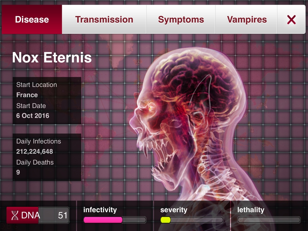 Samotná hra začíná výběrem místa vzniku epidemie, které je podle mě stěžejní pro úspěšnost celé hry. Poté se snažíte rozšířit infekci do dalších zemí a to prostřednictvím kolonky Transmission v sekci Disease, kde výběr bude zase jen na vás. V další kolonce Symptoms rozšiřujete smrtelné účinky viru, které zrychlují proces vyhubení lidské rasy. V poslední důležité kolonce Abilities měníte charakteristiky epidemie a schopnost populace viru zabránit a zpomalit vývoj léku. Hra je totiž dokonalým simulátorem, kdy se lidstvo snaží epidemii zabránit a vynalézt lék, který celou naší civilizaci zachrání.